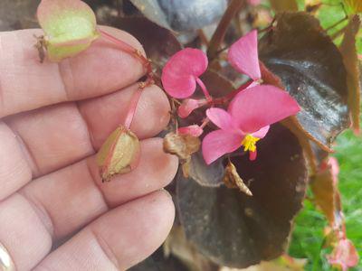 La plus grosse fleur en haut de la photo est une fleur femelle, elle est double. Les trois autres au bas de la fleur femelle sont des fleurs mâles, elles sont simples. Vous remarquerez que pour tous les Bégonias ce sont les fleurs mâles qui portent les graines.
